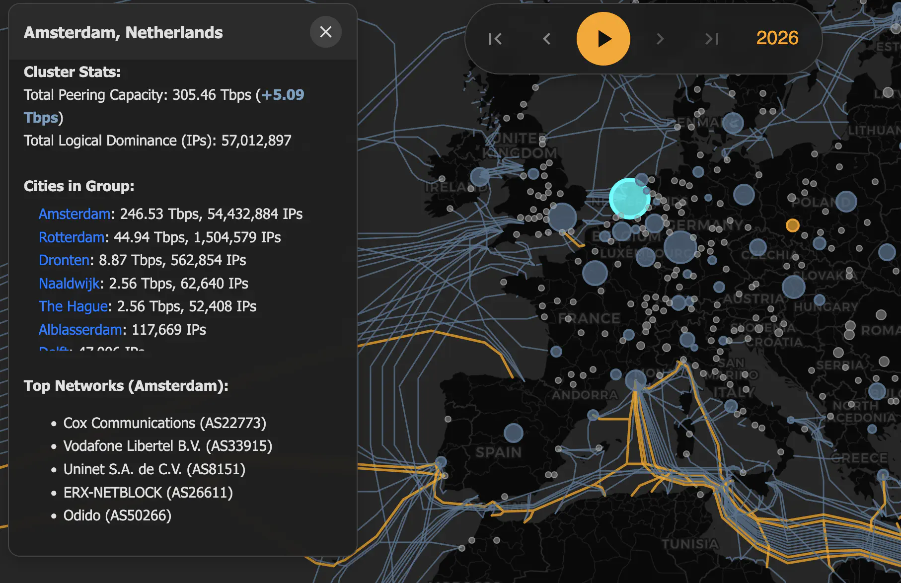 The visual size of cities on the map also now dynamically reflects their importance. Previously, cities were sized based only on their relative peering bandwidth. Now, their size depends on a weighted combination of aggregate peering bandwidth and IP dominance, contributing 80% and 20% to the size calculation respectively. Although this ratio is arbitrary and was picked for aesthetic reasons, peering bandwidth is a stronger signal of real traffic concentration than raw IP space alone, so I think it should be emphasized significantly more.
