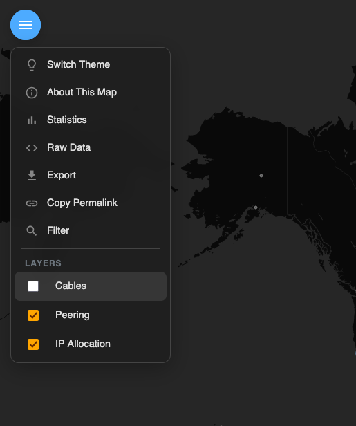 Now, the map can be sliced into three layers: Cables, peering bandwidth, and IP allocations. There are controls that allow you to show or hide each of these layers individually.